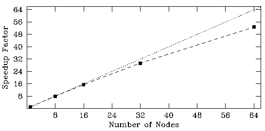In practice, this recipe for dividing the workload between the available processors proved to be very scalable. Since very little data is exchanged between the master and slave tasks, our 64-node Linux cluster provided a speedup factor of about 53 over the performance on a single processor.